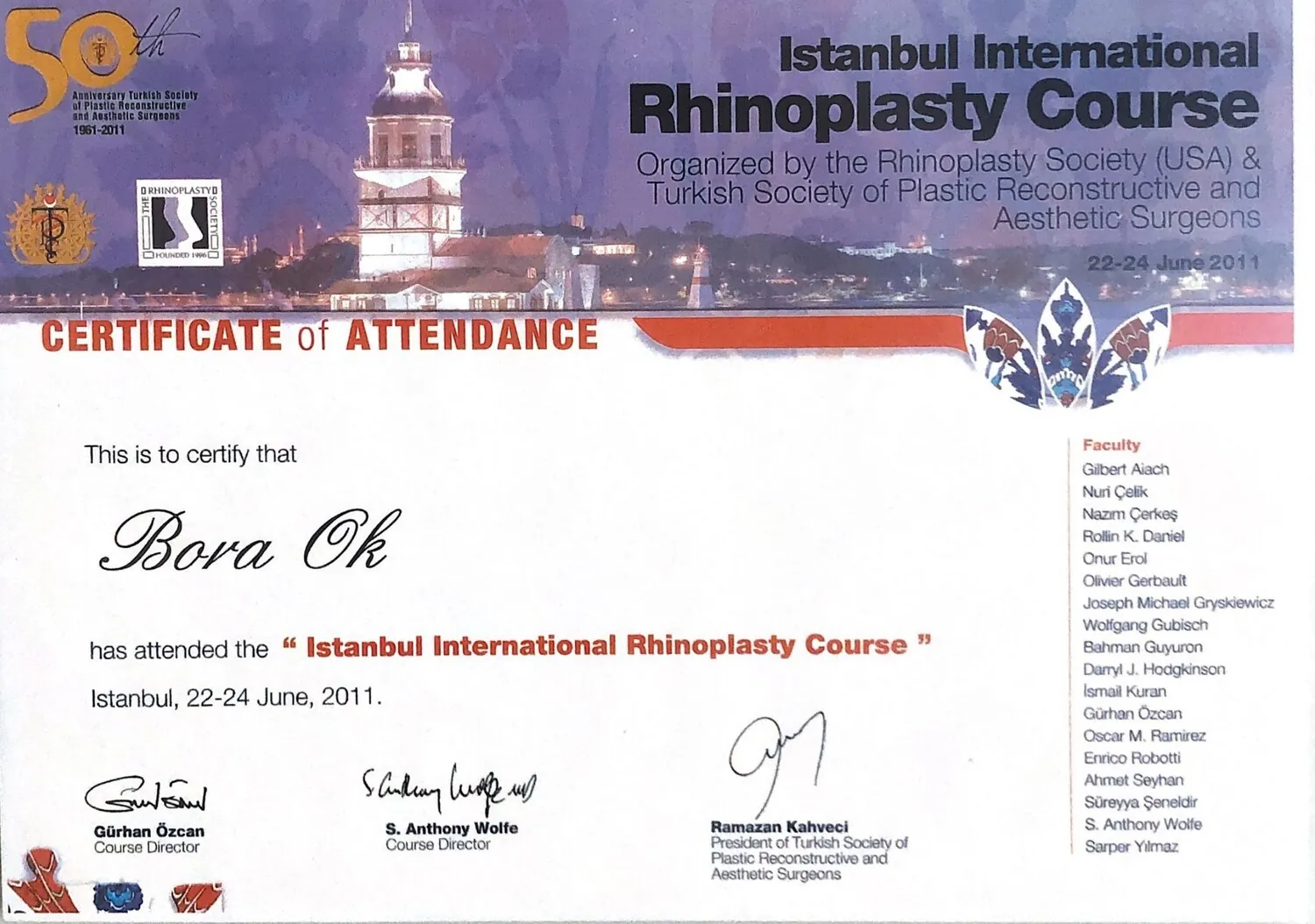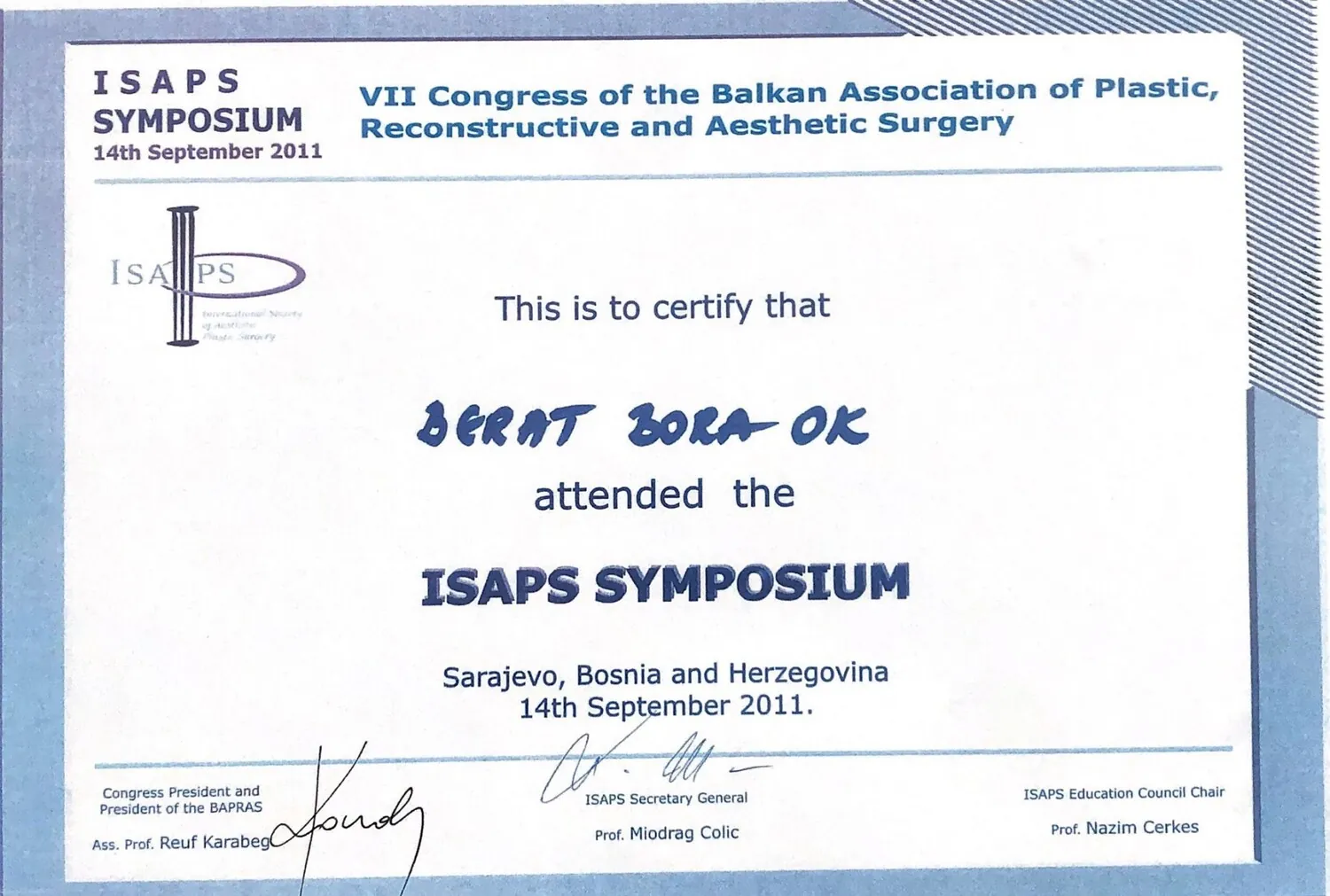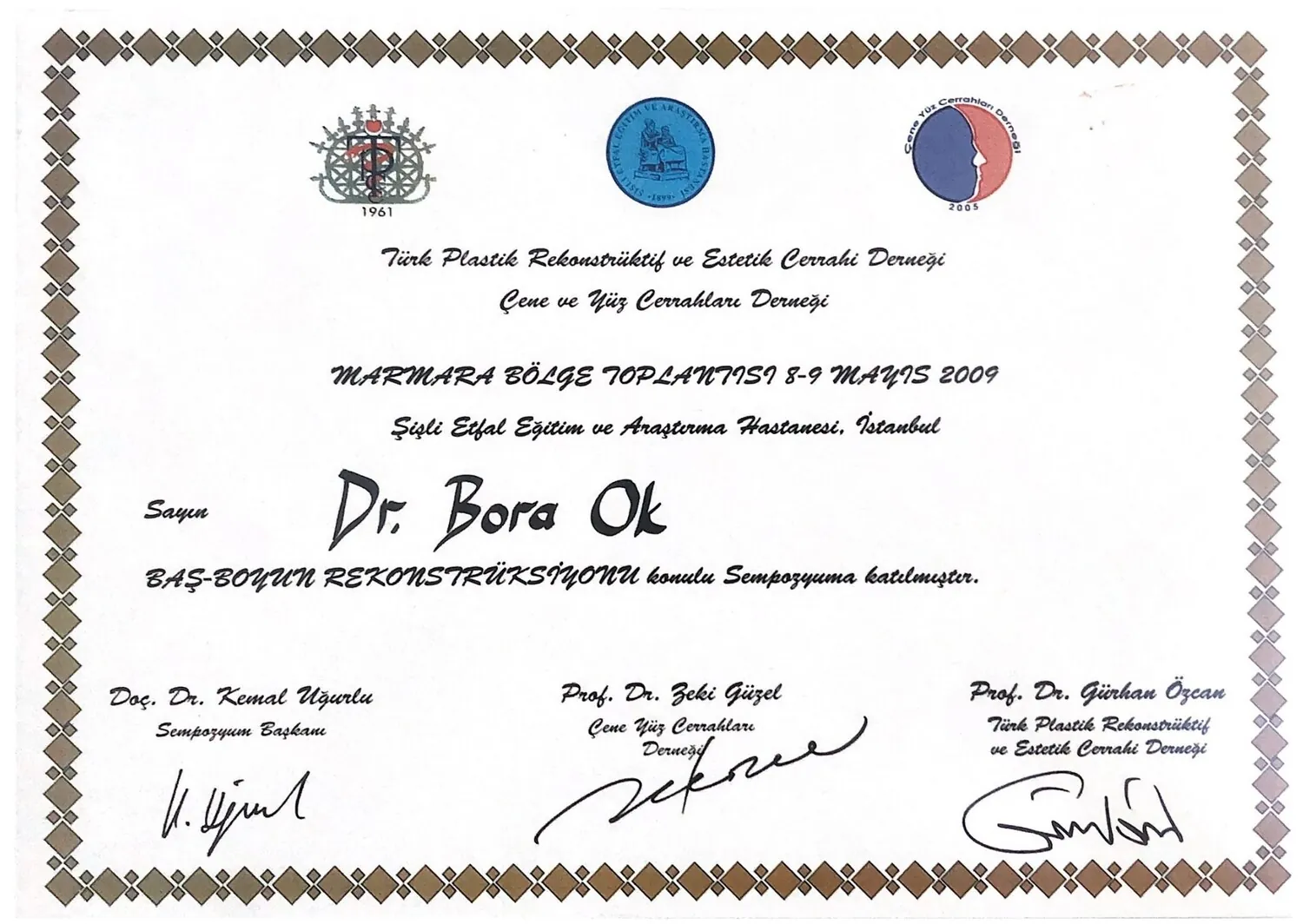 Ok B., Akçay Ö., Akyurek M., Cihandide E., Uzunismail A., Oral Presentation Head and Neck Session,moderator BAPRAS 2011 7. CONGRESS OF THE BALKAN ASSOCIATION OF PLASTIC,RECONSTRUCTIVE AND AESTHETIC SURGERY, Eylül 2011, Saraybosna, Bosna – Hersek