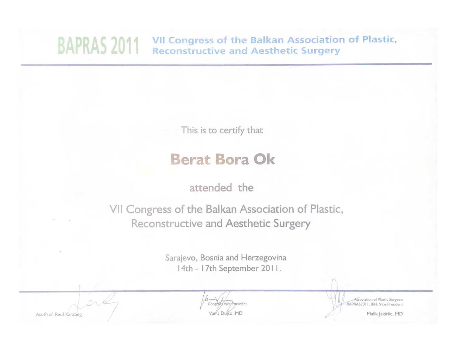 Akyurek M., Eraslan T., Ok B., Uzunismail A., REPORT, Poster presentation, BAPRAS 2011 7. CONGRESS OF THE BALKAN ASSOCIATION OF PLASTIC, RECONSTRUCTIVE AND AESTHETIC SURGERY, Eylül 2011, Saraybosna, Bosna – Hersek.
